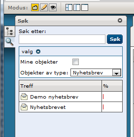 Dersom man velger en klasse i “Objekter av type” uten å skrive inn søkebegrep vises alle objekter av denne klassen som søkesvar.