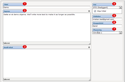 Dersom man ønsker tilbakemeldinger fra sine brukere er skjema et enkelt objekt å legge på siden. Et fullstendig skjema består av et skjemaobjekt (som vist her) og en rekke Skjemafelt objekter som spesifiserer de ulike feltene som brukeren skal fylle ut. Husk å fylle inn e-post-adresse til mottaker, og legg inn knappetekst.