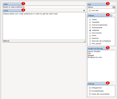 Her legges verdiene inn dersom man har felt av type Avkrysningbokser, Radiobokser, Valgliste eller Abbonér på nyhetsbrev. - Feltvalg